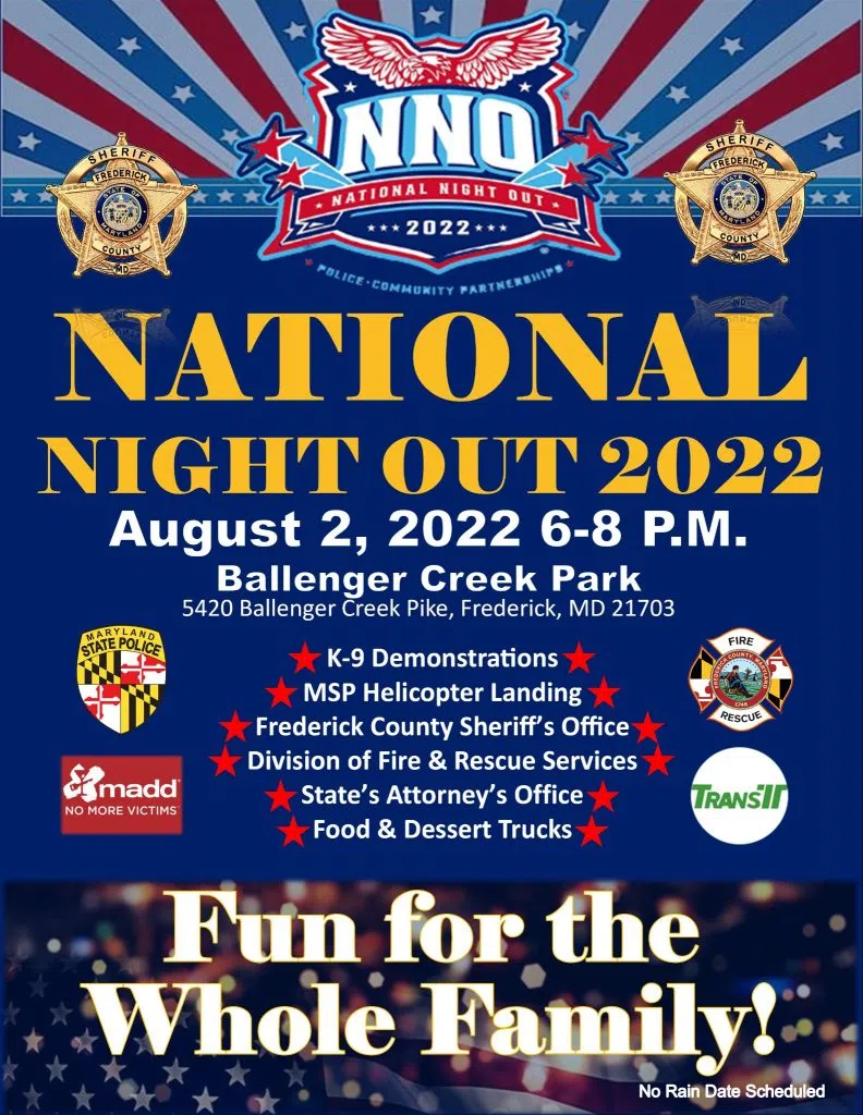 Frederick, Md. (KM) – Frederick County residents are invited to National Night Out on Tuesday, August 2nd. The Sheriff’s Office is hosting the event which will take place at Ballenger Creek Park, 5420 Ballenger Creek Pike, from 6:00 PM to 8:00 PM.